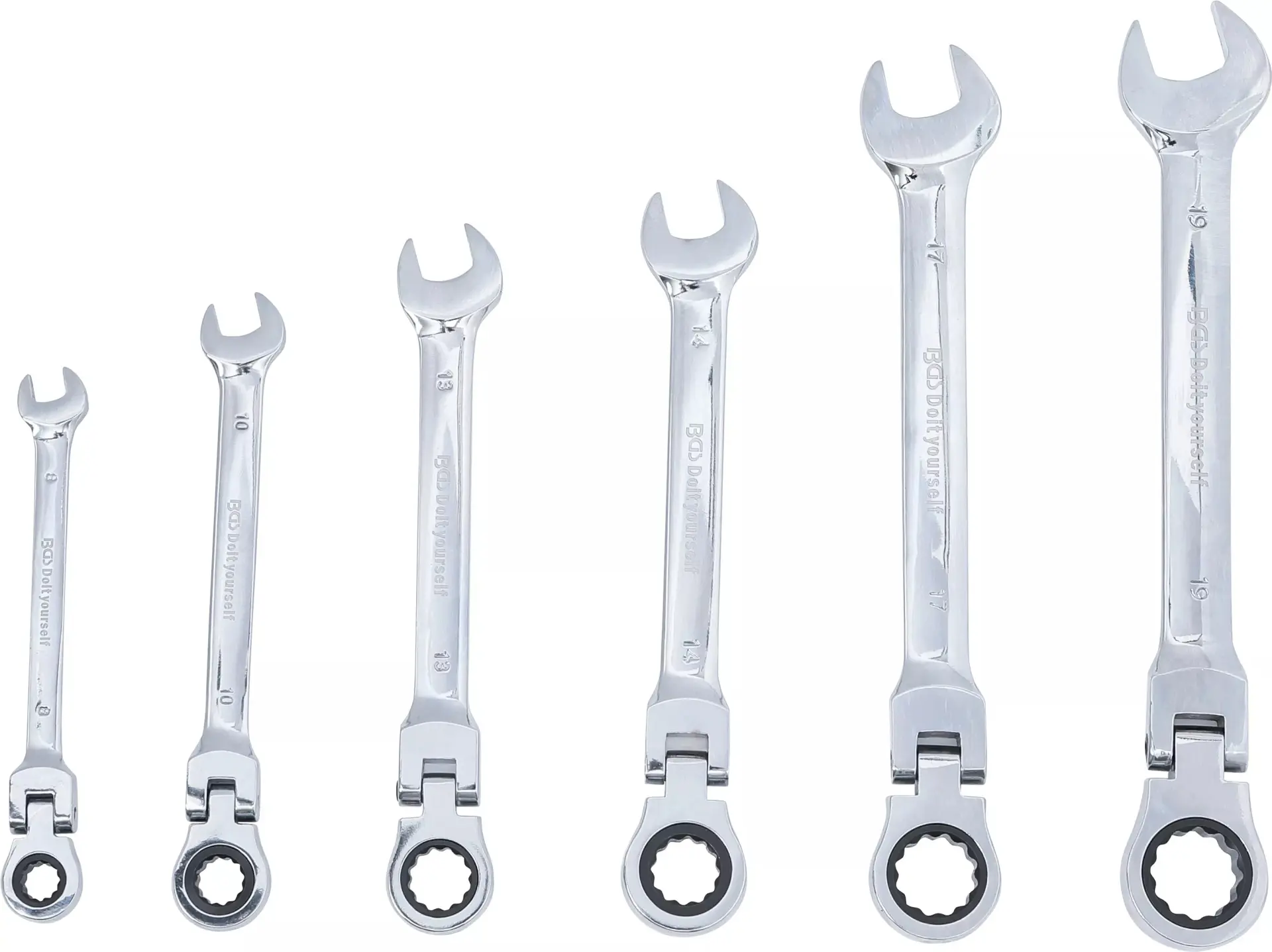 Sada šesti kloubových očkoplochých ráčnových klíčů Kraftmann 8–19 mm umožňuje práci v těžko přístupných místech a zrychluje utahování i povolování šroubů. Robustní konstrukce a ráčnový mechanismus usnadňují manipulaci bez nutnosti neustálého překládá