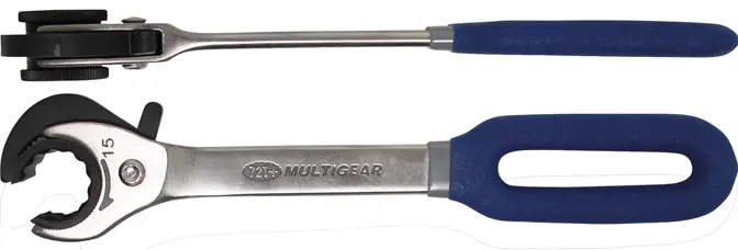 Otvorený prstencový kľúč s račňou - prevedenie pre prácu s potrubím a pre prevlečnej matice.