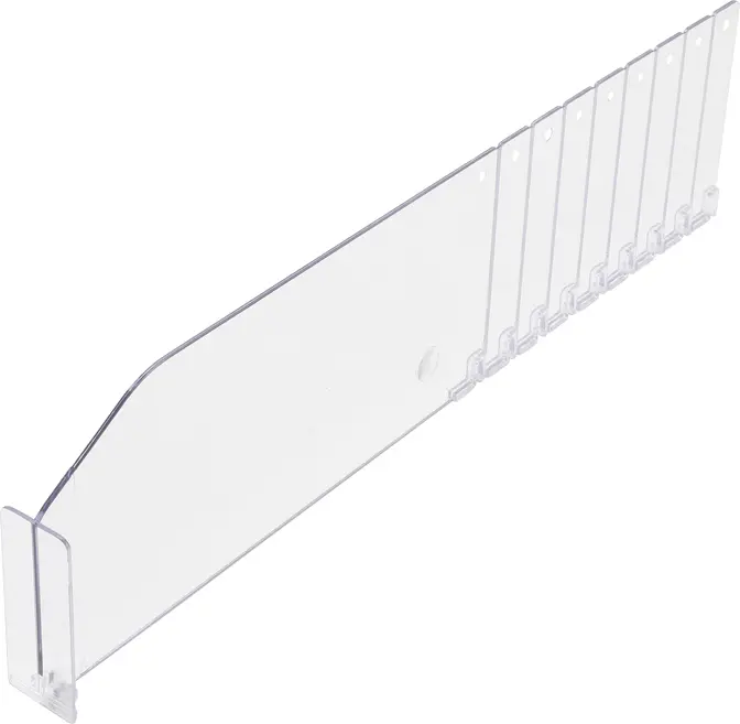 Plastový policový rozdeľovač je určený na efektívne rozdelenie úložného priestoru v policiach a regáloch. Vďaka priehľadnému dizajnu umožňuje jednoduchú orientáciu medzi uloženými položkami bez potreby premiestňovania deliaceho prvku alebo obsahu police.