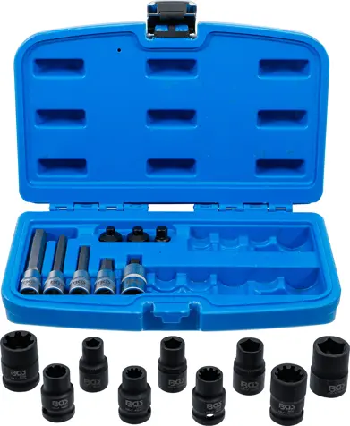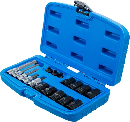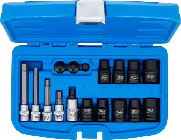 Sada 17 dílů BGS1074283 obsahuje nástrčné klíče a hlavice 1/4", 3/8" a 1/2" určené pro práci s brzdovými třmeny. Vhodné pro přesné povolování a utahování spojů v automobilovém servisu.