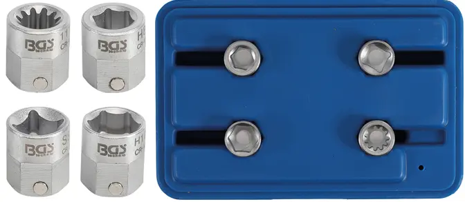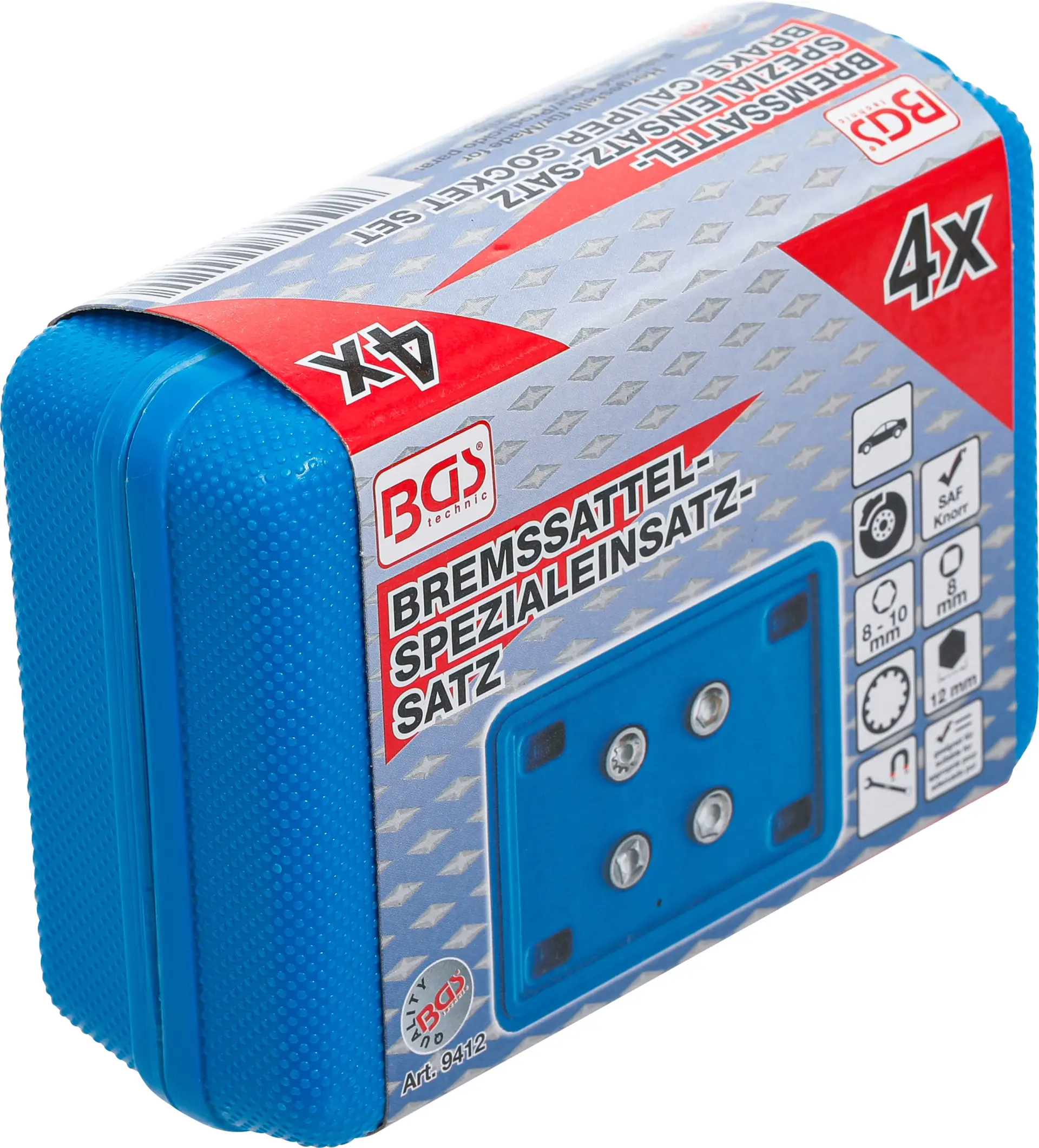 Sada čtyř speciálních nástrčných hlavic BGS109412 je určena pro práci s brzdovými třmeny, kompatibilní s běžnými ráčnami a vyrobená z odolné oceli. Vhodné pro profesionální i domácí použití při údržbě brzdových systémů.