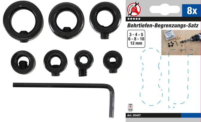 Osmidílná sada omezovačů hloubky vrtání umožňuje přesné nastavení hloubky vrtání a je vhodná pro různé průměry vrtáků. Snadná montáž i demontáž.