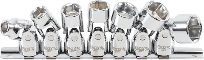 Tato sada univerzálních hlavic je určena pro práci s palcovými šrouby a maticemi v rozmezí 3/8" až 3/4". Obsahuje sedm dílů, které pokrývají nejběžnější velikosti používané v automobilovém průmyslu, strojírenství i domácí dílně. Všechny hlavice mají šestihranný profil, což zajišťuje pevné uchopení a minimalizuje riziko poškození spojovacího materiálu.