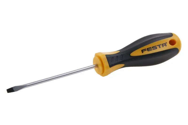 Plochý skrutkovač FESTA 3x75 mm má magnetický hrot, ergonomickú rukoväť a je vhodný na prácu s bežnými skrutkami v domácnosti a dielni.