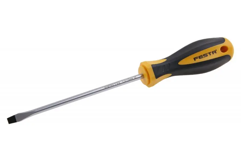 Plochý skrutkovač FESTA 5,5x125 mm má ergonomickú rukoväť a odolnú oceľovú pracovnú časť, ktorá je vhodná na bežné skrutkovanie v domácnosti a dielni.