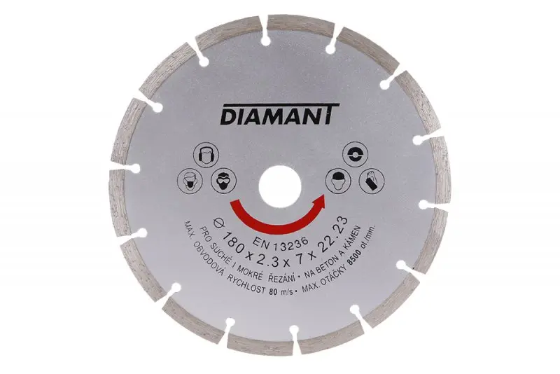 Pri výrobe čepele boli použité priemyselné diamanty, ktoré zabezpečujú vysokú účinnosť rezania a dlhú životnosť. Segmenty sú pevne upnuté, čo minimalizuje riziko ich uvoľnenia počas pro