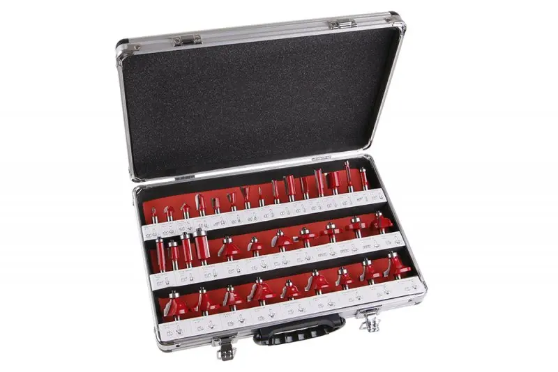 Všetky frézy sú prehľadne uložené v praktickom kufríku, ktorý uľahčuje ich organizáciu a prenášanie. Každý nástroj má svoje pevné miesto, čo znižuje riziko straty a zabezpečuje rýchly prístup pri výmene fréz počas práce.