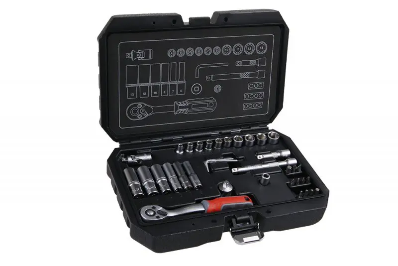 Gola sada 36ks 1/4" FESTA (L17231) na domáce a profesionálne použitie Táto gola súprava obsahuje 36 starostlivo vybraných 1/4" dielov pokrývajúcich širokú škálu bežných aj menej bežných montážnych a opravárenských úloh. Všetky komponenty sú uložené v praktickom plastovom kufríku, ktorý uľahčuje prenášanie a organizáciu náradia. Súprava obsahuje račňu, predlžovací nástavec, adaptéry na kĺby a sadu nástrčných hlavíc rôznych veľkostí. Vďaka tomu je možné pracovať v ťažko prístupných miestach a zvládnuť úlohy, ktoré si vyžadujú presnosť a variabilitu. Všetky diely sú vyrobené z odolnej chróm-vanádiovej ocele, ktorá zaručuje dlhú životnosť a spoľahlivosť pri pravidelnom používaní. Povrchová úprava chráni nástroje pred koróziou a opotrebovaním, čo ocení každý, kto pracuje v dielni alebo na stavenisku. Ergonomicky tvarovaná račňa umožňuje pohodlné uchopenie a účinný prenos sily. Súprava je vhodná na prácu s menšími skrutkami a maticami, takže je ideálna na údržbu automobilov, domácich spotrebičov alebo
