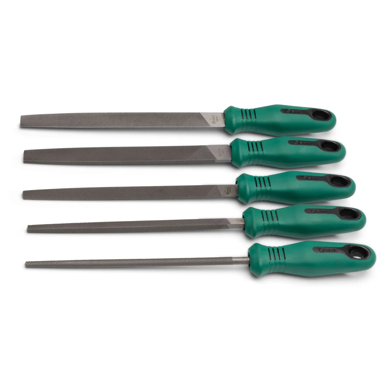 Sada pěti mini pilníků SATAST03901ME o délce 8" nabízí různé tvary pro přesné opracování kovu, dřeva i plastu v dílně nebo domácnosti. Ergonomické rukojeti zajišťují pohodlné držení při práci.