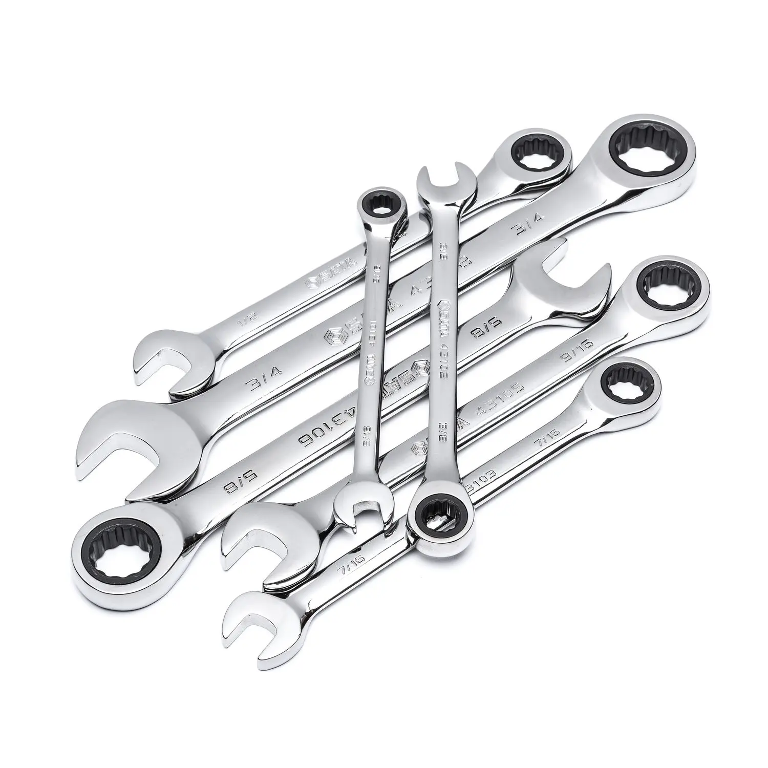 Sada obsahuje 7 kombinovaných ráčnových klíčů v palcových rozměrech SAE, které umožňují rychlé a efektivní utahování i povolování šroubů. Ergonomicky tvarované rukojeti a odolná konstrukce zajišťují dlouhou životnost při každodenním používání.