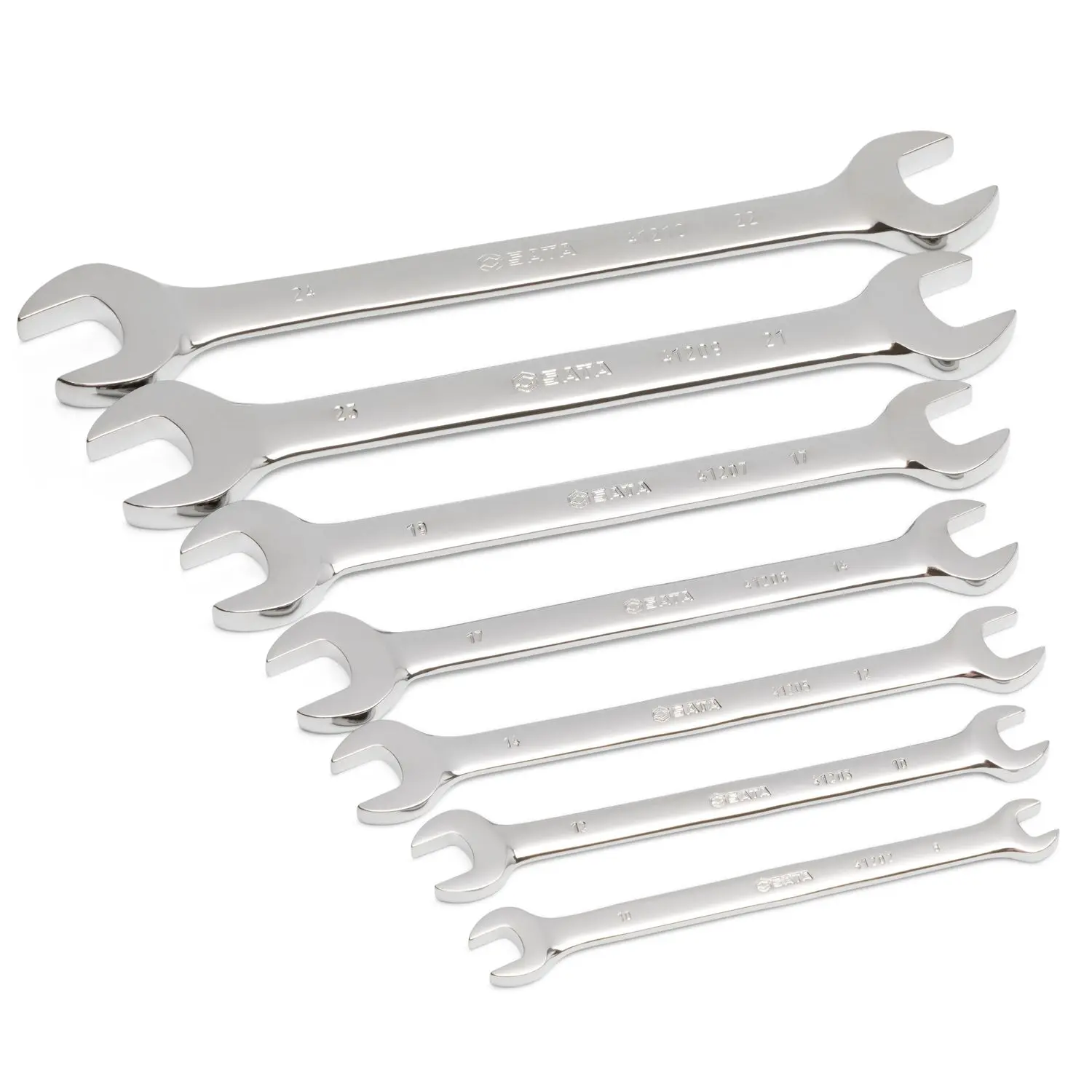 Sada metrických klíčů SATA obsahuje sedm kusů klíčů s dvojitým profilem, které pokrývají nejběžnější rozměry potřebné pro práci v dílně, garáži i domácnosti. Každý klíč je navržen pro přesné uchopení metrických šroubů a matic, což zajišťuje efektivní přenos síly a minimalizuje riziko poškození spojovacích prvků.
