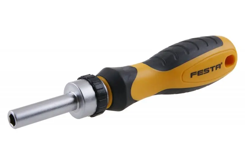 Ráčnový skrutkovač 1/4" umožňuje rýchlu výmenu bitov a prácu v ťažko prístupných miestach vďaka kompaktnému dizajnu a ergonomickej rukoväti.
