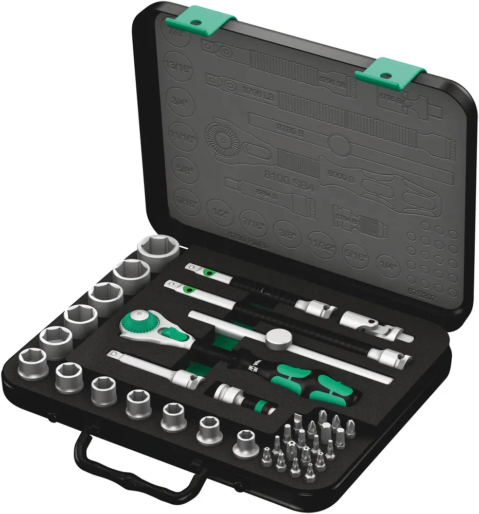 • 38dílná sada Zyklop ve stabilním kovovém kufříku: Ráčna Zyklop s připojovacím rozměrem 3/8". Díky jemnému ozubení se 72 zuby je možný malý zpětný úhel 5°. Hlava ráčny je otočná a díky posuvným tlačítkům po obou stranách ji lze zajistit v každé poloze. Bezproblémová práce s dostatkem místa pro ruce je možná i ve velmi úzkých nebo obtížně dostupných místech montáže. Definované upevnění při 0°, 15° a 90° doleva a doprava zaručuje bezpečnou práci bez sesmeknutí hlavy ráčny. V poloze 0° lze použít ráčnu s adaptérem a bitem jako běžný šroubovák. Konstrukce se setrvačnou hmotou zajišťuje urychlení šroubovacího procesu. Rotačně symetrická konstrukce rukojeti Kraftform a volnoběžné pouzdro podporují razantní otáčení. Díky speciálnímu tvaru rukojeti Kraftform, skvěle přizpůsobenému ruce, se předchází úrazům rukou, vzniku otlaků a mozolů. Tvrdé materiály, použité pro rukojeť zaručují rychlé přehmátnutí bez nebezpečí "přilepení" pokožky k rukojeti. Měkčí, "neklouzavé" zóny umožňují bezeztrátový přenos větších sil. pro ořechy 3/8" s čtyřhranem a spojovací díly 3/8" s připojovacím rozměrem pro čtyřhran, se zajišťovací kuličkou. S 12 palcovými ořechy, 2 prodlouženími Zyklop s rychloběžným pouzdrem, 1 příčnou rukojetí, 1 prodloužením Wobble, 1 kardanovým kloubem, 1 spojovacím dílem s rychloupínací hlavou, 19 bity. S identifikátorem nářadí "Take it easy": Barevné označení podle velikostí.