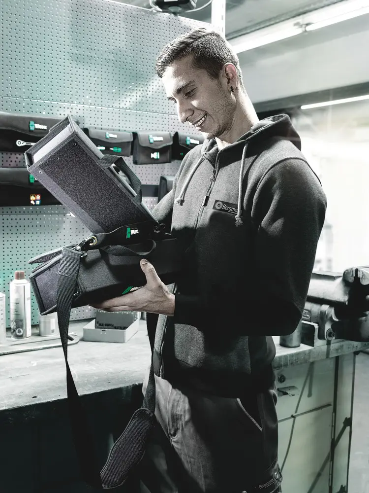 • Wera 2go 1 je super lehký a mobilní nosič nářadí určený pro veškeré Wera brašny a textilní boxy se suchým zipem na zadní straně. Brašny a boxy je možné jednotlivě, snadno a bezpečně připevnit k nosiči pomocí suchého zipu. Díky ramennímu popruhu zůstávají ruce během nošení volné.
