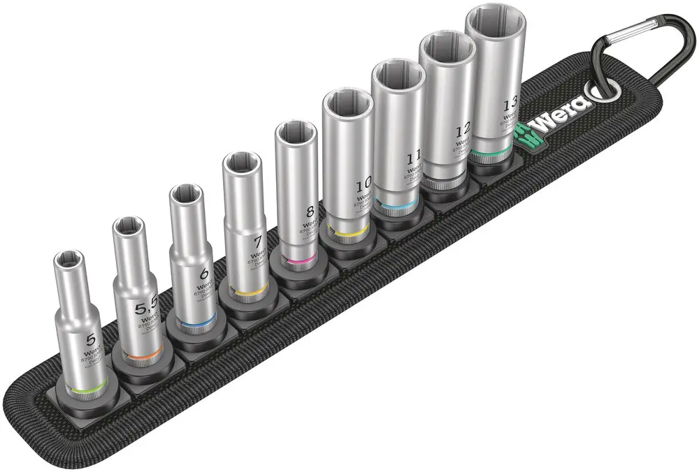 Robustní textilní pás v typickém designu Wera s 9 dlouhými 1/4" manuálními a strojními nástrčnými hlavicemi (non-impact) na nejužším prostoru. Otočný mechanismus s lehkým chodem se stará o bezpečnou oporu a lehké odebrání nástrčných hlavic. Včetně karabiny pro upevnění na smyčkách pásku nebo kapsy. S textilní zadní stranou a páskem se suchým zipem pro snadné upevnění např. na stěně, regálu, dílenský vozík a Wera 2go přepravní systém nářadí. Dlouhé 1/4" nástrčné nástavce pro ruční a strojní použití (ISO 2725 - Část 3) od Wera pro použití v ručním a strojním provozu (non impact) také u hlubokého šroubování a přesahujících závitových tyčí. S Take it easy identifikátorem nářadí s barevným označením podle velikostí - pro snadné a rychlé nalezení potřebného nářadí. Dobře sedící pro snadný úchop také s rukama od oleje. S šestihranným profilem a se zajišťovací drážkou pro kuličku. Pro šrouby a matice s vnějším šestihranem.