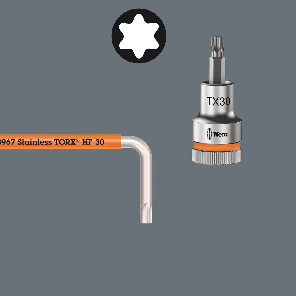 • Vysoce kvalitní nerezový čtvercový klíč pro vnitřní šrouby TORX®. Úhlové klíče jsou díky vakuově kalené, zmrazené nerezové oceli velmi odolné vůči korozi a nedochází tak k přenosu cizí koroze na šroubové spoje z nerezové oceli. S přidržovací funkcí na dlouhém profilu: Prostřednictvím síly sevření z přítlaku ploch mezi profilem bitu a profilem šroubu drží šrouby bezpečně na nářadí. S extra dlouhým profilem pro práce v hlubokých pozicích. Na omak příjemné plastové opláštění usnadňuje šroubování také při nízkých teplotách. "Take it easy" identifikátor nářadí s barevným označením podle velikostí.