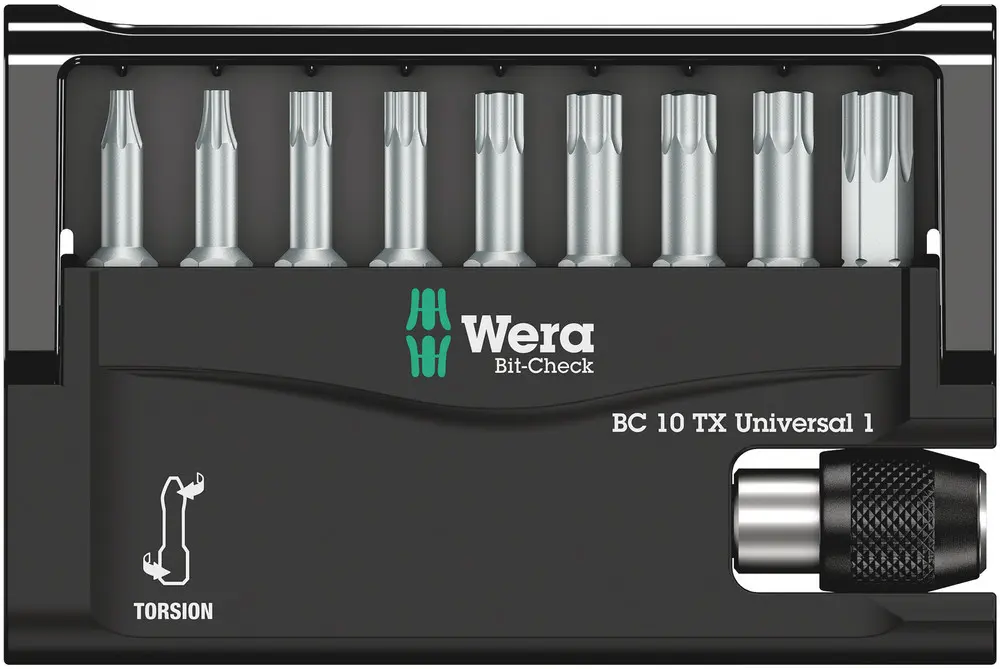 • Robustní krabička Bit-Check od firmy Wera. Krabičky Bit-Check umožňují rychlý přehled o dostupném nářadí. Nepotřebné bity se jednoduše vrátí do krabičky, aby se neztratily. Jednoduché přemístění, např. v kapse u košile. Včetně univerzálního držáku s rychloupínací hlavou. Pro upnutí bitů s připojovacím rozměrem vnějšího šestihranu 1/4" podle DIN ISO 1173-C 6,3. Pro upnutí do šroubovacího zařízení nebo pro použití ve sklíčidle elektronické vrtačky. Včetně houževnatých bitů TORX®, pro univerzální použití.