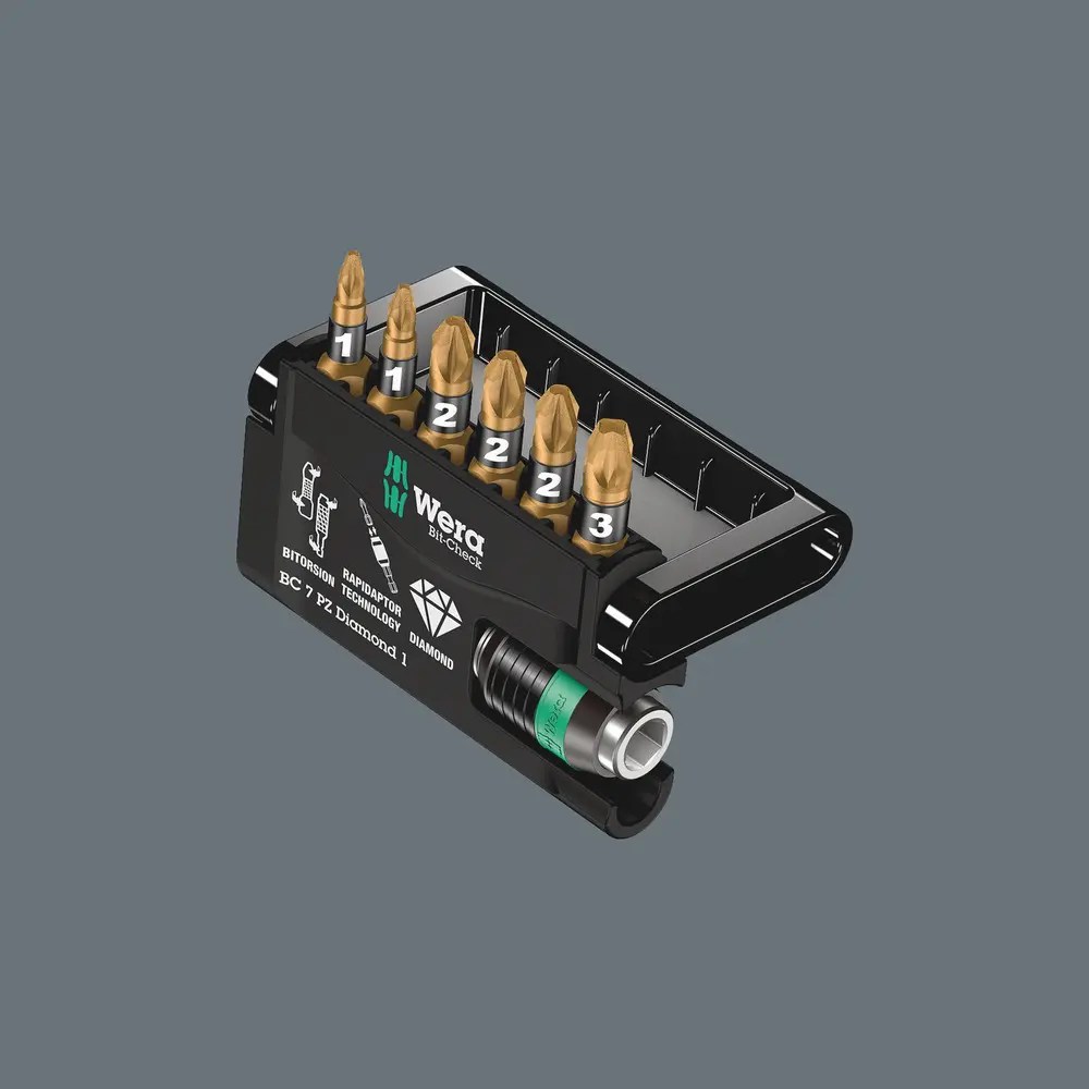 • Kvalitní bity s miniaturními diamantovými částicemi na špičce bitu. Tyto částice zajišťují bezpečné uchycení v šroubu, redukují potřebný přítlak a snižují nebezpečí sesmeknutí. S torzní zónou, do které je při zátěžových špičkách odvedena kinetická energie. S měkčí torzní zónou pro zabránění deformace špičky bitu při vysokém zatížení. Díky tomu výrazné prodloužení životnosti produktu. Šestihran 1/4", vhodný pro držáky podle DIN ISO 1173-D 6,3. Torzní bity včetně identifikátoru nářadí Wera "Take it easy".