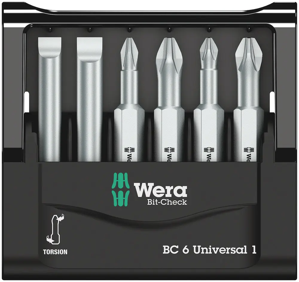 6 bitů Wera s délkou 50 mm uspořádaných přehledně na minimální ploše v praktické krabičce Bit-Check. Houževnaté bity jsou vhodné pro univerzální použití. U torzních bitů (TZ) jsou navíc špičky utahovacích momentů tlumeny v torzní zóně. Předchází se tak předčasnému opotřebení, zvyšuje se životnost bitu.