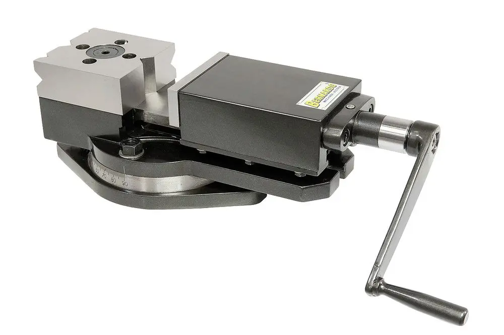 Univerzálny zverák s masívnou otočnou pevnou čeľusťou v prevedení strán - hladká, zvislé prizma, horizontálne prizma a kombinovaná prizma. Celý zverák je otočný so stupnicou