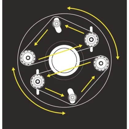 • Dva opačne bežiace (protichodé) brúsne pásy na rotujúce hlave, rotácia obrobku je eliminovaná
