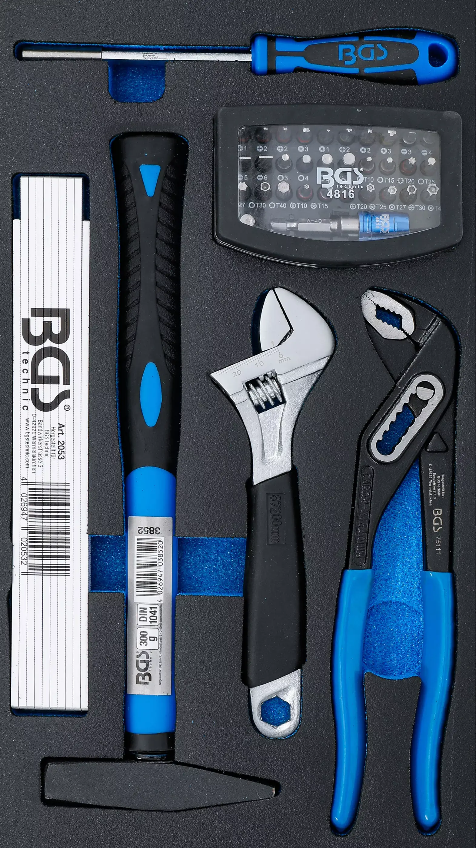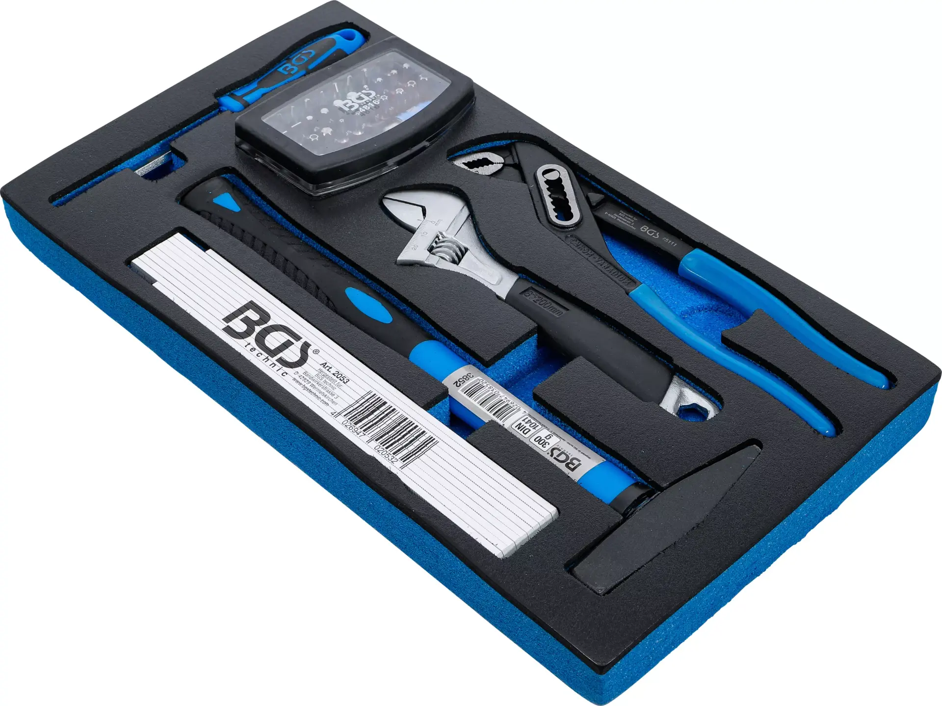 Náraďový modul - penová vložka do dielenského vozíka 2/3: Vybavená kladivom, kliešťami, nastaviteľným kľúčom, bitmi a skladacím metrom, presne sedí do zásuvky a uľahčuje prehľadné uloženie náradia. Materiál zaisťuje ochranu pred poškodením a rýchle n