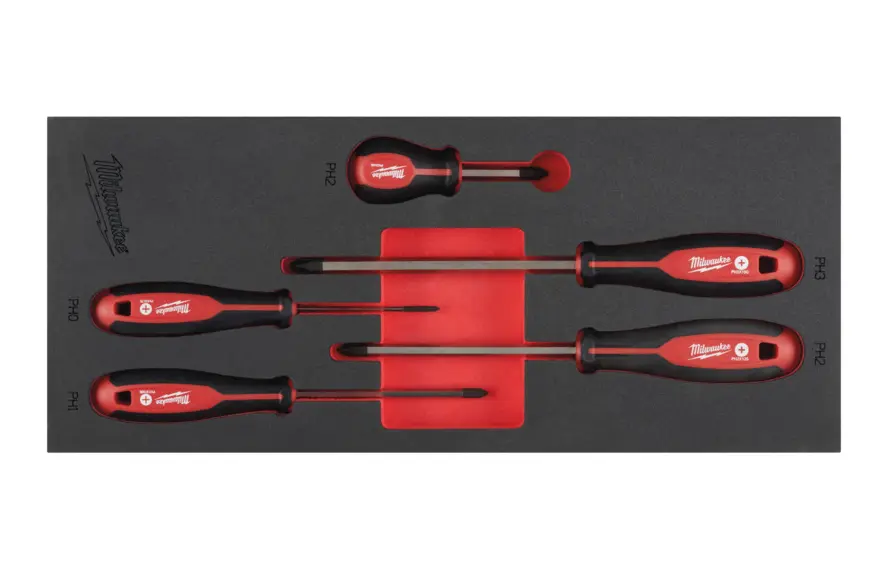 Sada 5 ks kvalitních šroubováků od výrobce Milwaukee; magnetické hroty; pohodlná rukojeť Tri-lobe; křížové: PH; kulatý i upravený dřík přizpůsobený k dotažení klíčem; sada v pěnové podložce (vložce).