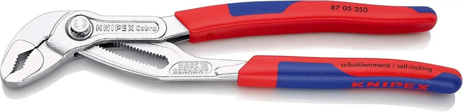 Kliešte na rúrky 250 mm. KNIPEX 8702250 -Cobra KNIPEX-Cobra, HiTech inštalatérske kliešte. Patentované. Technické údaje Dĺžka rukovätí [mm]: 250 Rozpätie pracovnej oblasti: - pre matice [mm]: 36 - pre rúrky pr. [palce]: 1 1/2 Význačné rysy