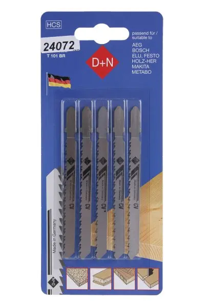 Súprava 5 pílových listov na priamočiary rez s dĺžkou 75 mm a hrúbkou 1,45 mm. Čepele sú vyrobené z HCS (vysokouhlíkovej ocele), materiálu vhodného na rezanie mäkkého dreva, drevotriesky a iných drevených materiálov. Vďaka tejto kombinácii veľkosti a materiálu sú plátky vhodné na všeobecné domáce a dielenské použitie.