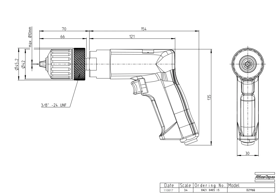 Pneumatická ručná pištoľová vŕtačka s rýchloupínacím skľučovadlom Atlas Copco D2112Q