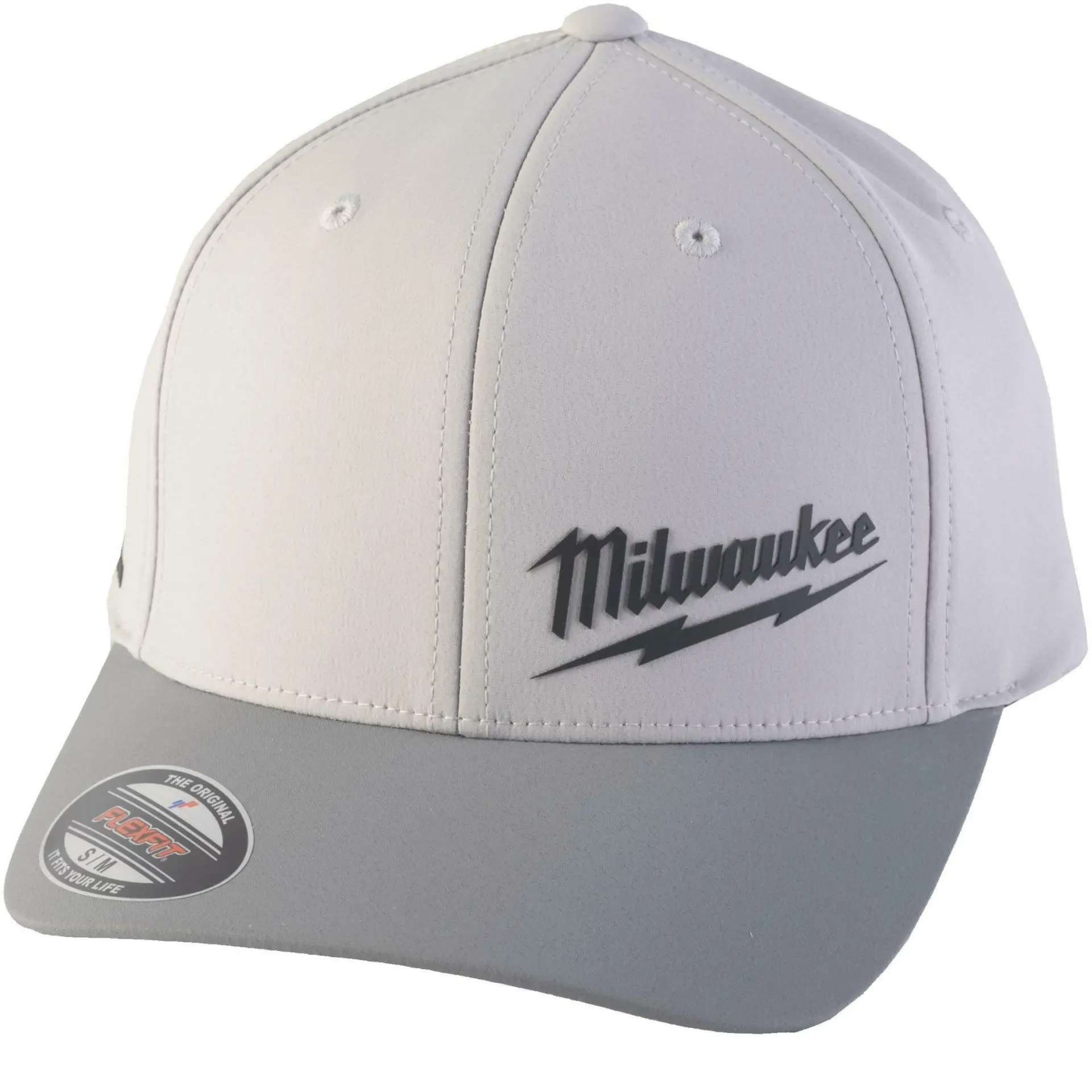 Originál Milwaukee. Šedo/stříbrná baseballová čepice s kšiltem a černým logem Milwaukee. Celouzavřená konstrukce.