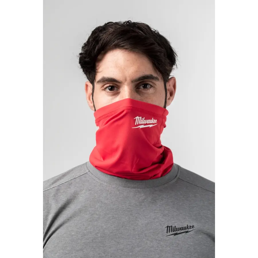 Funkční nákrčník Milwaukee v červené barvě je vyroben z prodyšného materiálu, chrání krk před větrem a prachem a snadno se přizpůsobí tvaru obličeje.