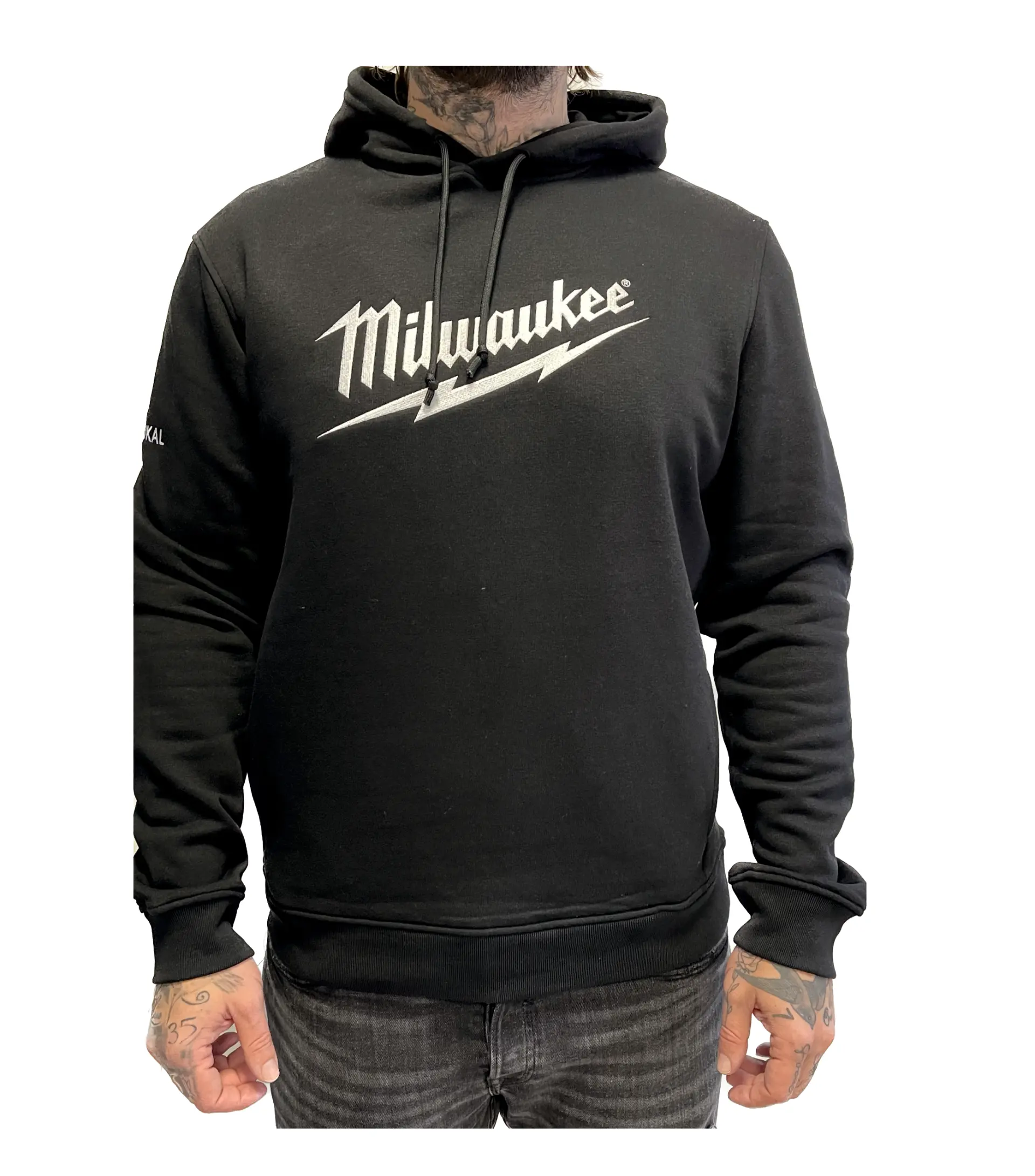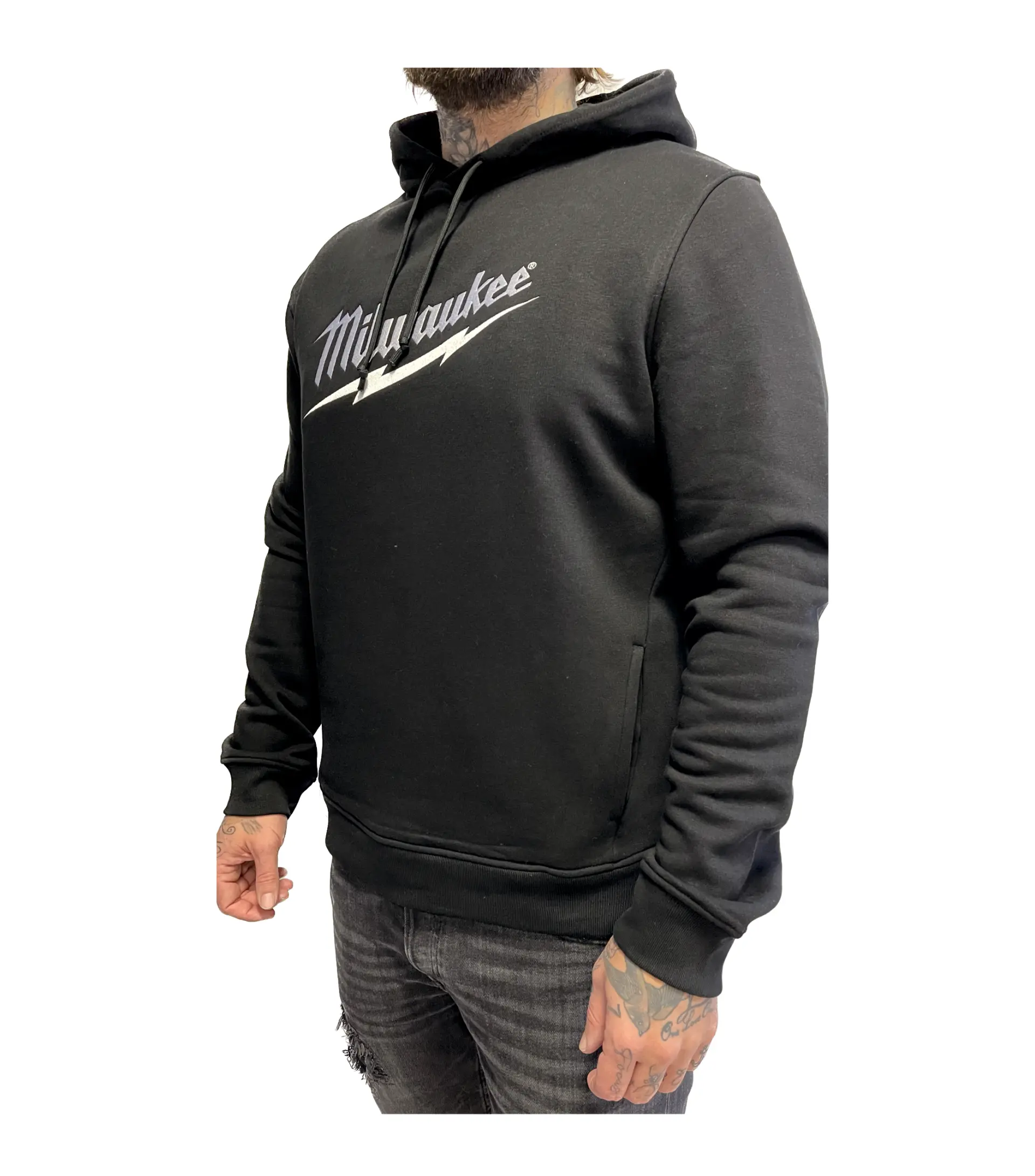 Mikina Milwaukee ve velikosti XXL v černé barvě má kapuci, žebrované manžety a praktickou klokaní kapsu, vhodná pro běžné nošení i práci. Materiál je směs bavlny a polyesteru.