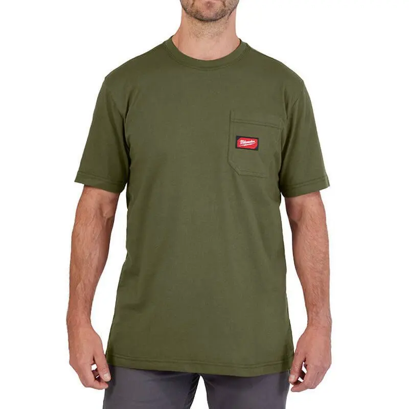 Pracovní triko Milwaukee WT SS GN v zelené barvě je vyrobeno z odolného materiálu, má krátké rukávy a střih vhodný pro každodenní nošení na stavbě i v dílně.