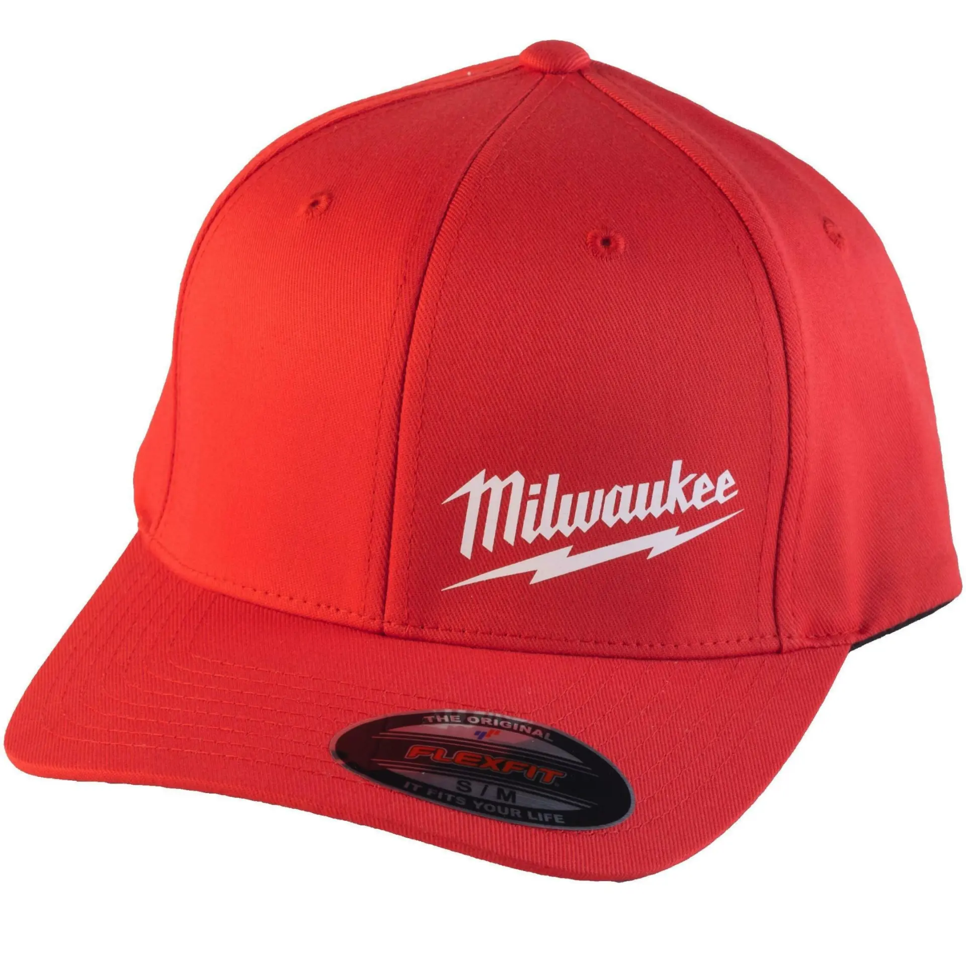 Originál Milwaukee. Červená baseballová čepice s kšiltem a bílým logem Milwaukee. Celouzavřená konstrukce s pružným obepnutím hlavy.