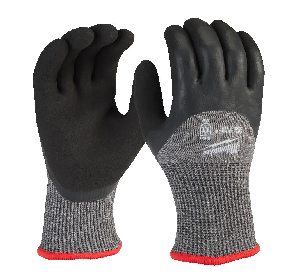 - Bezpečnostná norma: CE kategória 2; UKCA; EAC - Ochrana proti porezaniu: 5/E - Miera (stehy/palce): 13, 10 - Farba: červená - Materiál: Teplá akrylová froté vložka s 3/4 dvojitou latexovou dlaňou - Stupeň ochrany: EN ISO 21420:2020 | EN 388:2016 (3X43E) | EN 511 (X1X) Zimné rukavice s povrchovou úpravou Milwaukee s triedou ochrany proti porezaniu - Zimná tepelná izolácia a dvojitá akrylová podšívka udržujú ruky v teple pri práci v chladných podmienkach - Mäkkosť 13 GG pre vonkajšiu vložku a 10 GG pre vnútornú vložku zaručujú dobrú obratnosť prstov - Zvýšená vodotesnosť na ochranu rúk pred chladom a vlhkosťou s dvojitou latexovou vrstvou nanesenou namáčaním na 3 povrchoch - Vonkajšia a vnútorná vložka sú navzájom spojené, čo zvyšuje ich odolnosť - Európska certifikácia na ochranu proti porezaniu a chladu: EN ISO 21420, EN388:2016 (3X43E), EN511 (01X), UKCA