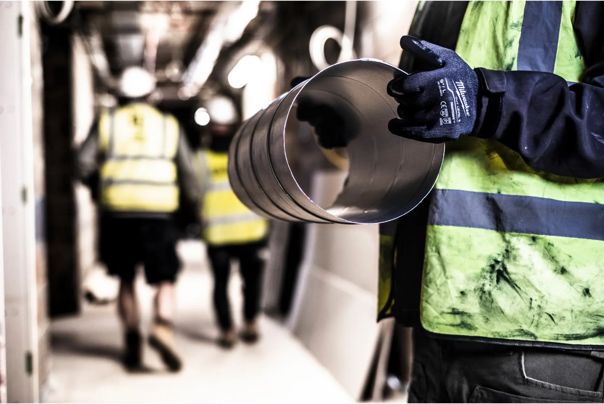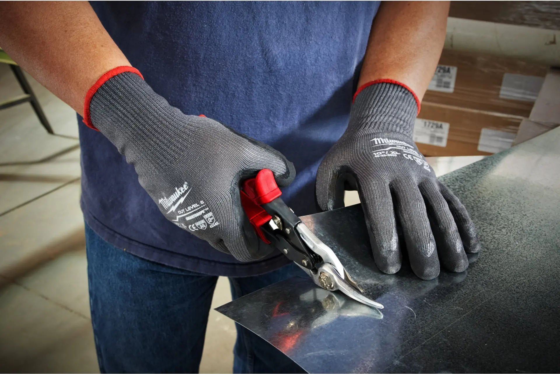Lehké a pohodlné pracovní rukavice (Balení s 12 páry) Milwaukee CUT E Glove třída ochrany E, zesílená nitrilová ochrana dlaně, vhodné pro celodenní nošení a manipulaci s materiálem, ovládání dotykových zařízení bez sundání rukavic.