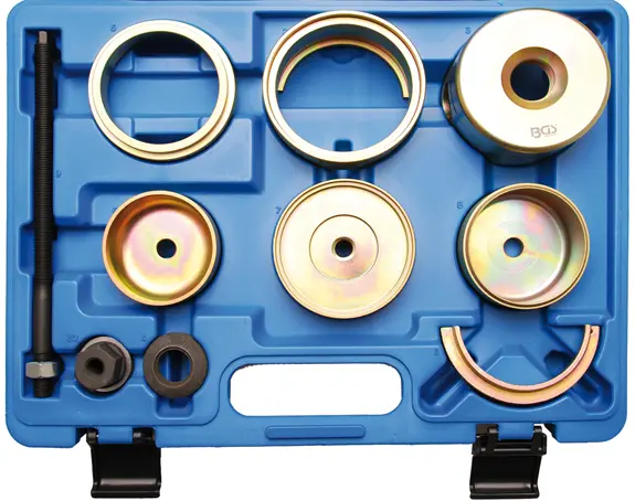 Sada 11 dílů BGS108779 je určena pro výměnu silentbloků zadní nápravy vozidel VAG, obsahuje adaptéry a přípravky pro přesnou a efektivní práci. Kompatibilita s více modely usnadňuje servisní zásahy.