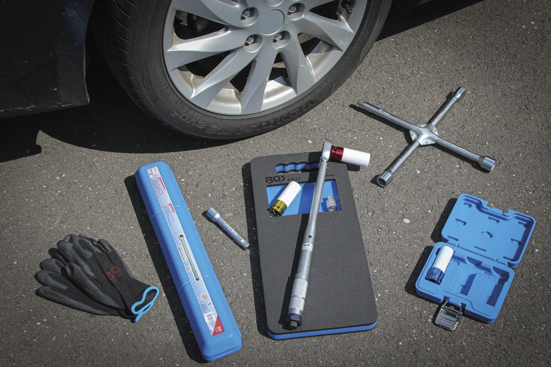 momentový kľúč 1/2" 28 ÷ 210 Nm, nadstavce 1/2": 17 - 19 - 21 mm, chránič kolien, rukavice 10 (XL), krížový kľúč 17 x 19 x 21 mm x 1/2" , mechanický zdvihák 1,5 t