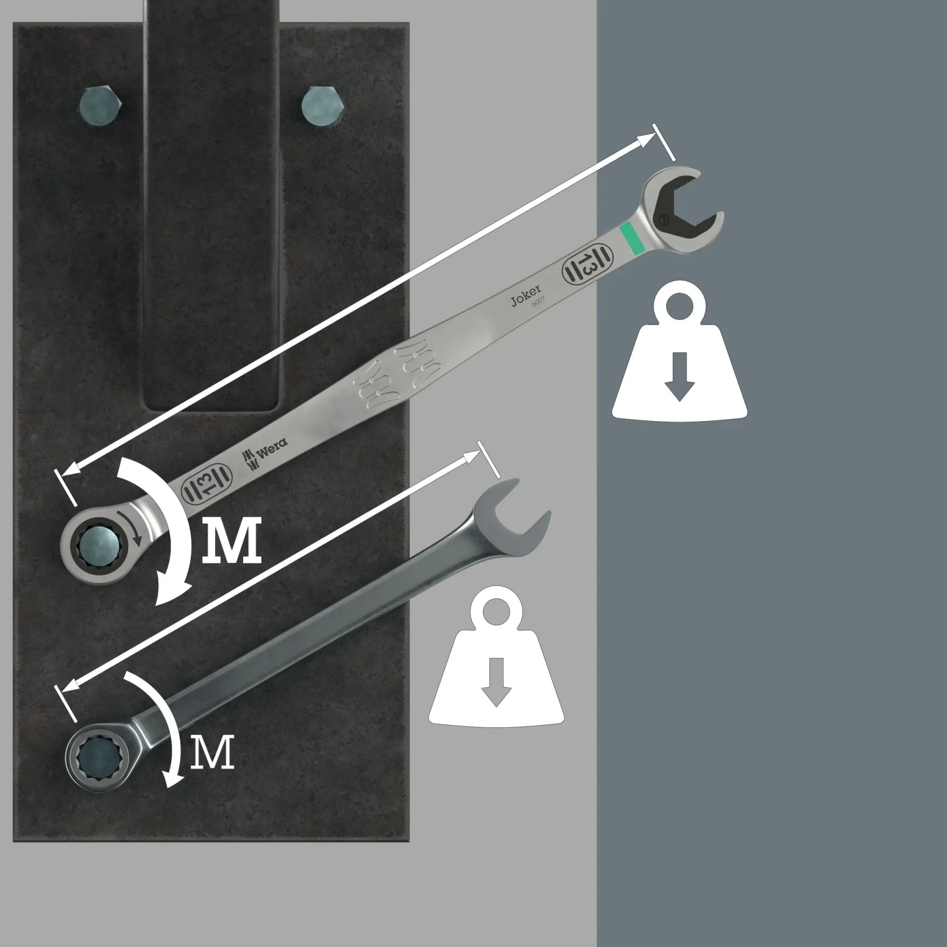 • Celosvetovo unikátna kombinácia otvoreného kľúča Wera a očkového račňového mechanizmu v dlhom prevedení