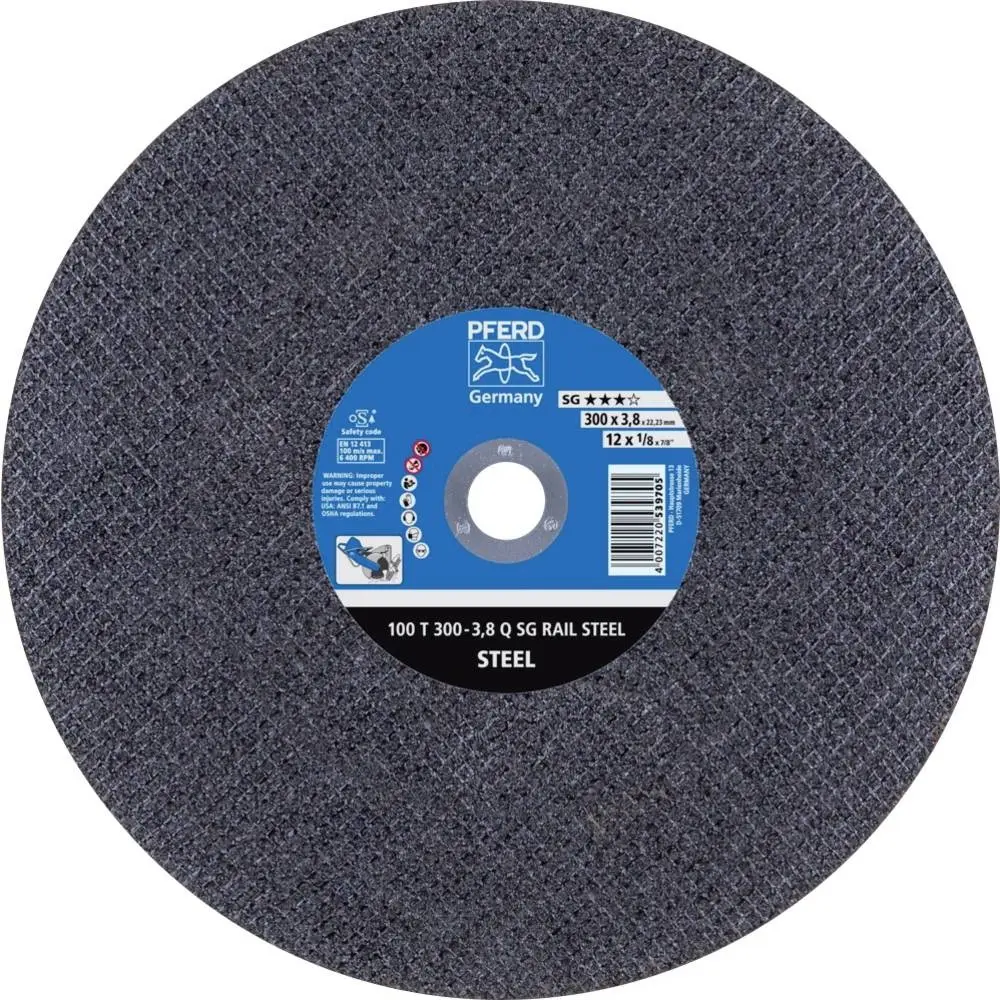 Řezací kotouč Pferd 100 T 300-3,8 Q SG RAIL STEEL/22,23 je určen pro dělení kolejnic, má průměr 300 mm, tloušťku 3,8 mm a upínací otvor 22,23 mm. Vhodný pro použití na ocelové kolejnice, zajišťuje přesný a rychlý řez.