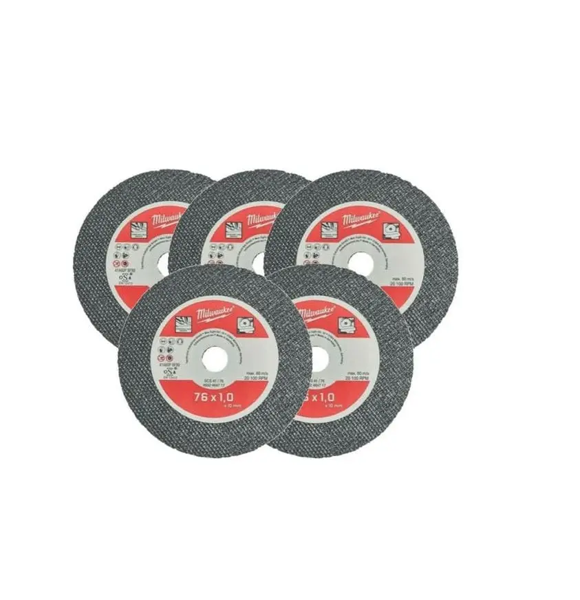 Sada pěti tenkých řezných kotoučů Milwaukee PRO+ SCS41 s průměrem 76 mm a tloušťkou 1 mm je určena pro přesné dělení kovových materiálů. Otvor 10 mm umožňuje kompatibilitu s běžnými úhlovými bruskami.