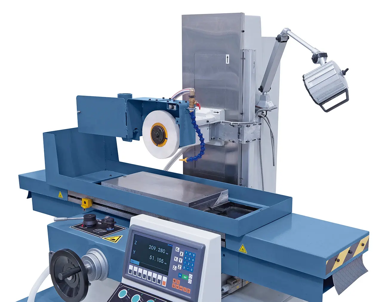 motor vretena 1,5 kW, otáčky 2850 U.min-1, pracovný stôl 250 x 520 mm, permanentný magnet 250 x 500 mm, posuv - pozdĺžny/priečny 560/260 mm, brúsny kotúč 200 x 20 mm, obrobok 150 kg, strojný posuv v osiach X a Y, rozmery 1700 x 1400 x 1750 mm
