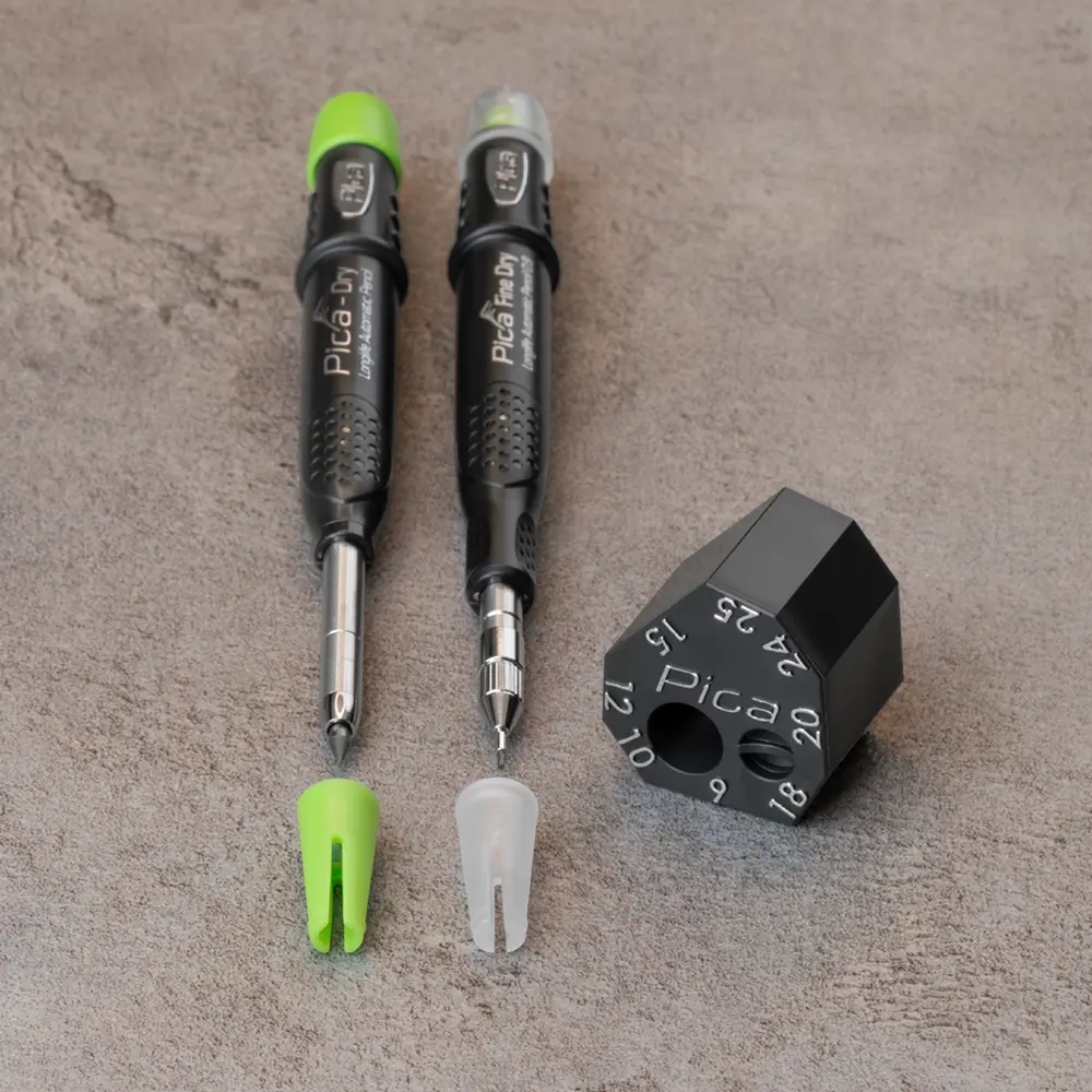 Set obsahuje vymeniteľné adaptéry, vďaka ktorým je kompatibilný s klasickou ceruzkou Pica-Dry (3030) aj jemnejšou Pica Fine Dry (0,9 mm)