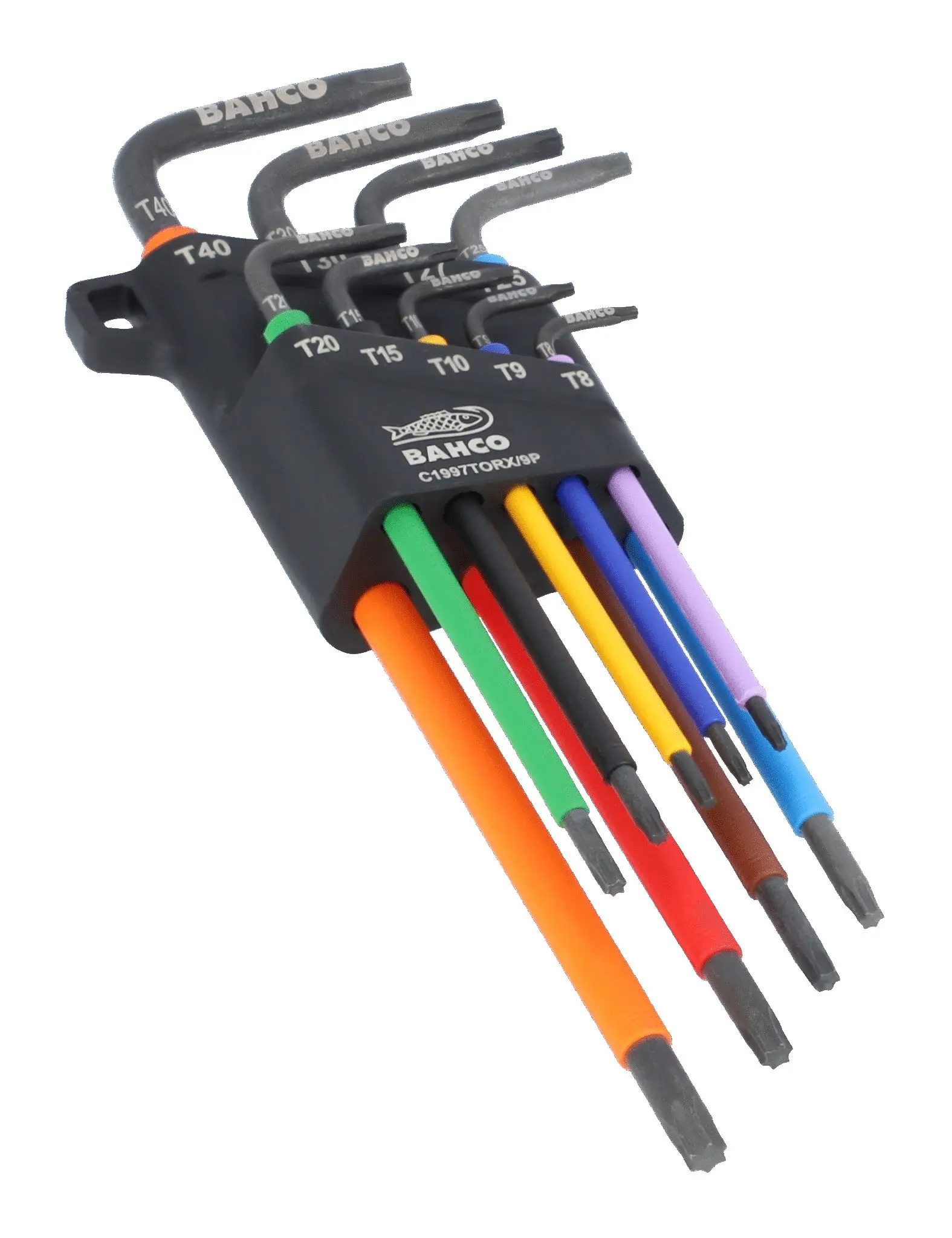 Sada dlhých zástrčných kľúčov s farebným hrotom TORX Bahco obsahuje 9 kusov T8, T9, T10, T15, T20, T25, T27, T30, T40, ktoré je možné bezpečne držať a veľmi ľahko vybrať a uložiť exkluzívnemu systému upevnenia