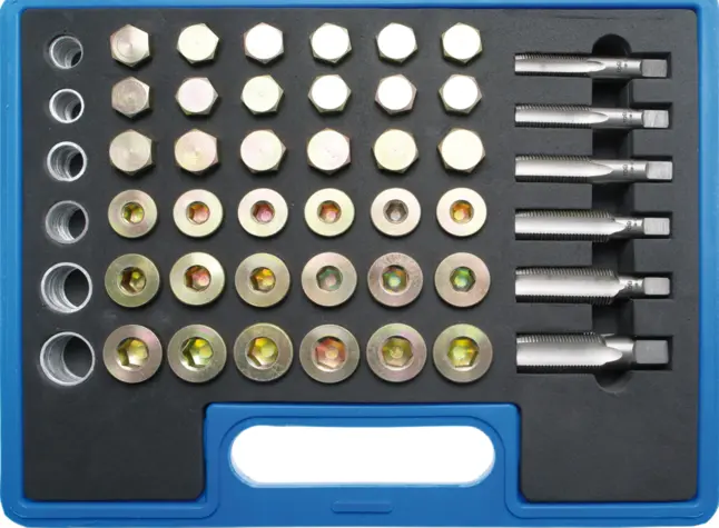 Sada pro opravu závitů výpustí olejových van BGS100123 obsahuje 114 dílů pro opravu poškozených závitů a je vhodná pro různé typy automobilů. Praktické balení usnadňuje přehlednost a manipulaci při práci v dílně i garáži.