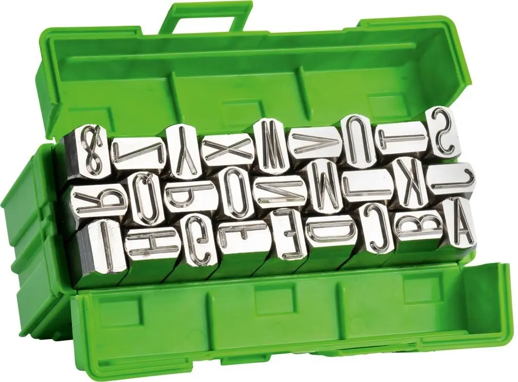 Prevedenie: 27díl. (A-Z - veľké písmená). Z kvalitnej nástrojovej ocele, druh písma podľa DIN 1451. Dodáva sa v sadách v plastovej dóze.