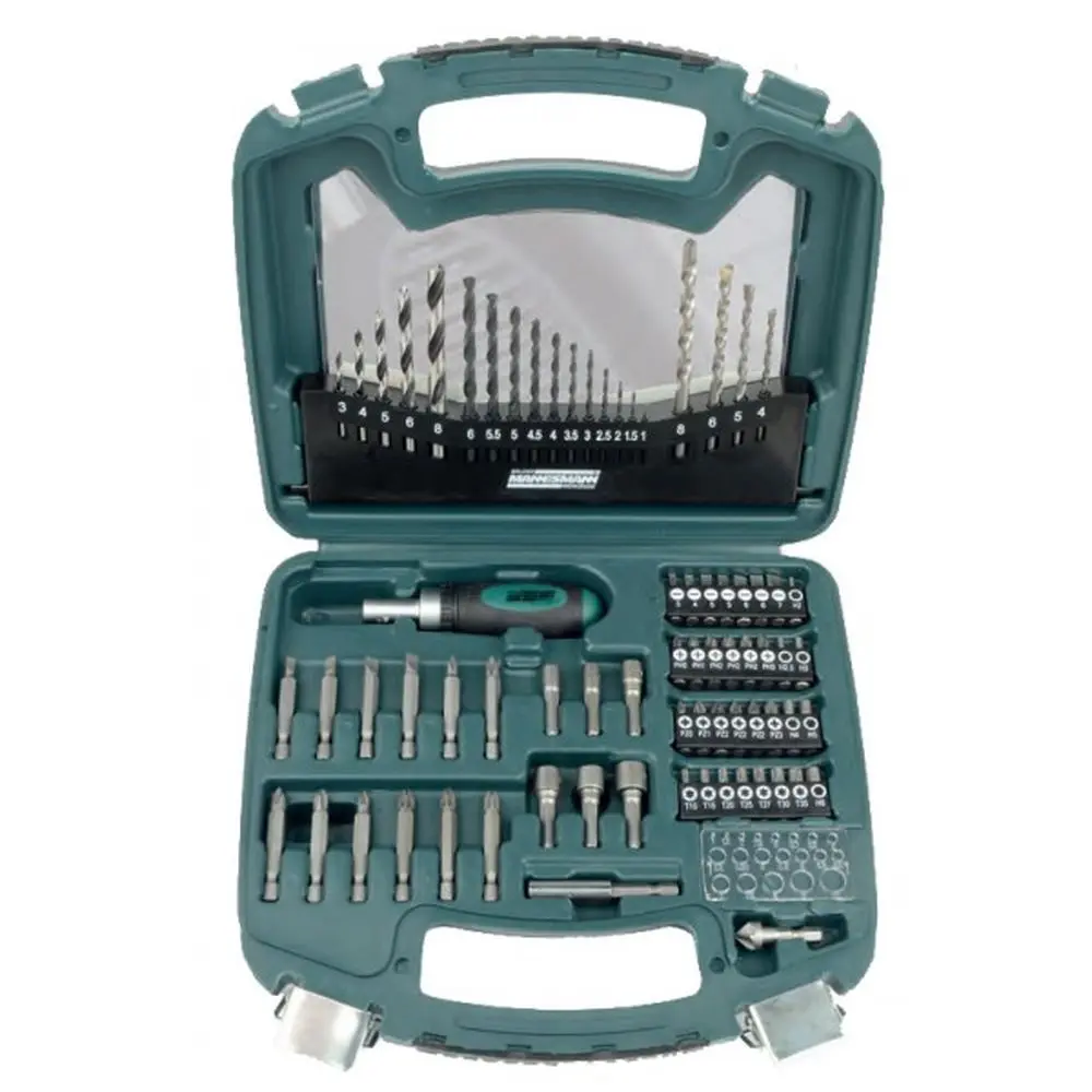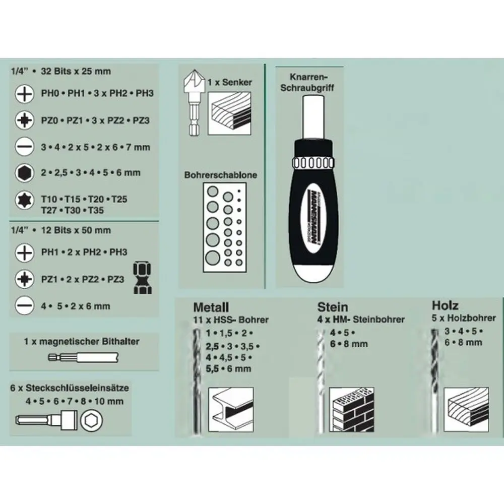 Univerzálna sada 1/4" nemeckého výrobcu Bruder MANNESMANN. Súprava nástrčných bitov 25 + 50 mm (T-profil, inbus, plochý bit, PH a PZ), sada vrtákov do dreva, sada vrtákov do betónu, sada HSS vrtákov, nadstavce 4 - 10 mm. V plastovom kufri.