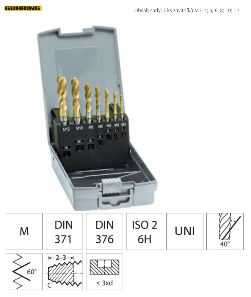 Strojové závitníky HSS-E UNI M3 ÷ M12 Gühring na slepé otvory, TiN (Sada 7 dielov) (EDE17912001)