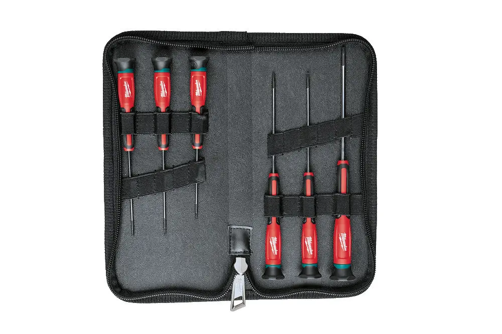 Sada 6 ks kvalitních mikro-šroubováků od výrobce Milwaukee; celokovové jádro; pohodlná rukojeť s otočným zadním krytem; Torx; kulatý dřík; odolné pouzdro s robustním zipem. Určeno pro jemnou a přesnou práci hodinářů i elektrikářů.